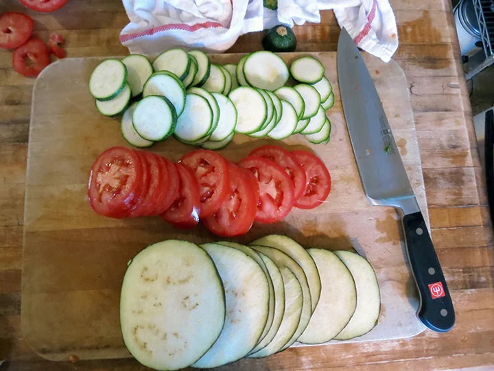 Spread out the sliced eggplant and zucchini in one layer on one sheet pan, and the tomatoes on another sheet pan. Drizzle with olive oil and season with salt and pepper. Roast vegetables, tossing zucchini and eggplant occasionally, 35 to 40 minutes.