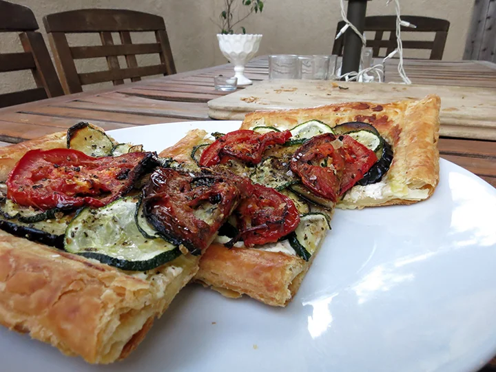Remove from oven when golden at edges. Spread a layer of goat cheese on the pasty and then add the vegetables. Return to oven at 425ºF for 15 minutes until golden brown. Add more olive oil and a pinch of sea salt. Cool on a wire rack for 20 minutes before slicing into squares and serve warm or at room temperature.